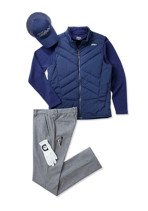 ベーシックカラーを組み合わせたシャープな着こなし。軽量かつ薄手のベストでスイングを伸びやかに。