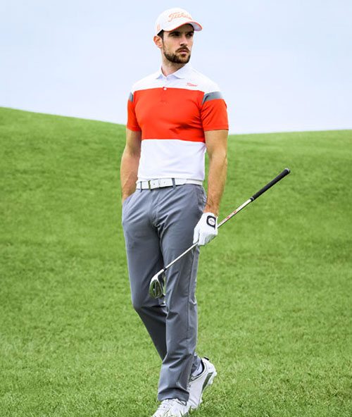 ツアーワッペン付のツアーフラッグシップシャツとスポーティなパンツを組み合わせた、速乾性抜群のアスリートゴルファーコーディネート。