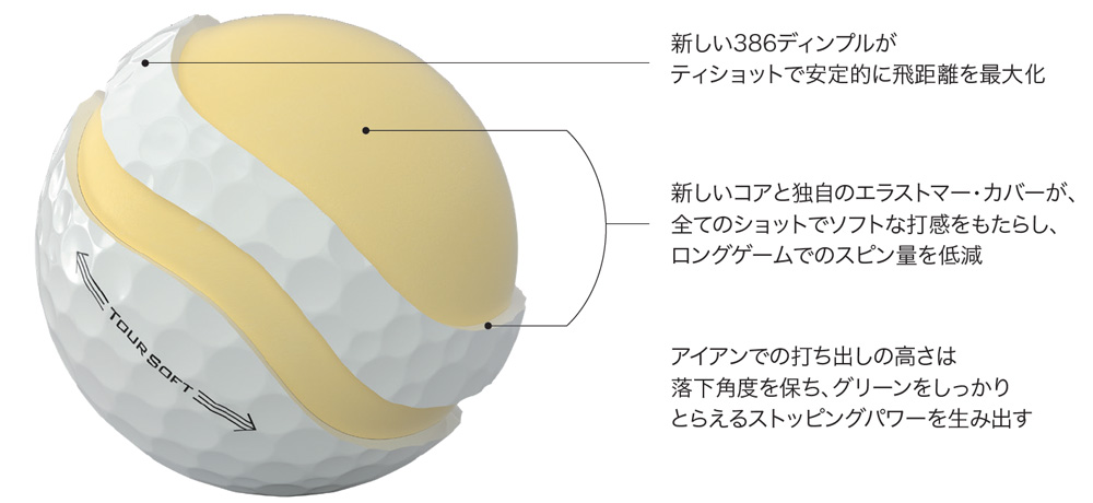 コアからカバーまで、すべてで進化したタイトリスト ツアーソフト。新しいコアサイズとエラストマー・カバーに、新しい空力性能を搭載しました。これにより、ドライバーでの飛距離アップを可能にし、アイアンでは高い弾道でしっかりグリーンをとらえ、すべての番手で驚くほどソフトな打感で、安定した性能を発揮します。