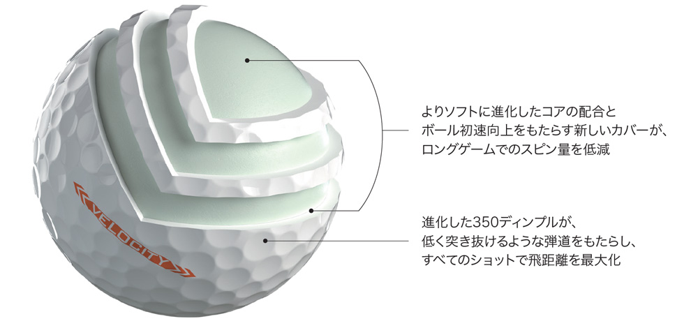 スピンを抑え、驚きのボール初速で、ティショットからグリーンを狙うショットまで、とことん飛距離にこだわったのが新しいタイトリスト ベロシティ。新しいカバーとコアの配合が、低スピンで鋭い弾道を生み出し、新しい空力設計が弾道の最高到達点を抑え、安定して大きな飛びをもたらす可能性が高まりました。