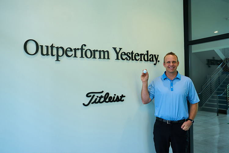 クラブハウスのメインエントランスから入ってすぐの壁面には、“Outperform Yesterday”のスローガンが掲げられています。ゴルフボールの開発拠点にこのスローガンを掲げた理由について、タイトリスト ゴルフボール マーケティング シニアバイスプレジデント、ジェレミー・ストーン は次のように話しています。