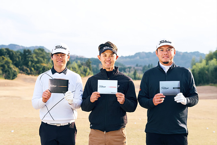 NEW「プロV1x レフトダッシュ」が登場し、プロV1ファミリーに大きな注目が集まる中、タイトリスト ブランドアンバサダーが参加するメディア向けお披露目イベントが行われました。参加したのは2025シーズンにツアー初優勝を挙げた阿久津未来也プロ(プロV1x使用)と下家秀琉プロ(プロV1使用)、そしてプロV1x レフトダッシュを愛用する幡地隆寛プロの3名です。イベントはそれぞれ愛用モデルが違う各プロがNEW「プロV1x レフトダッシュ」を打ったらどう感じるのか? からスタートしました。